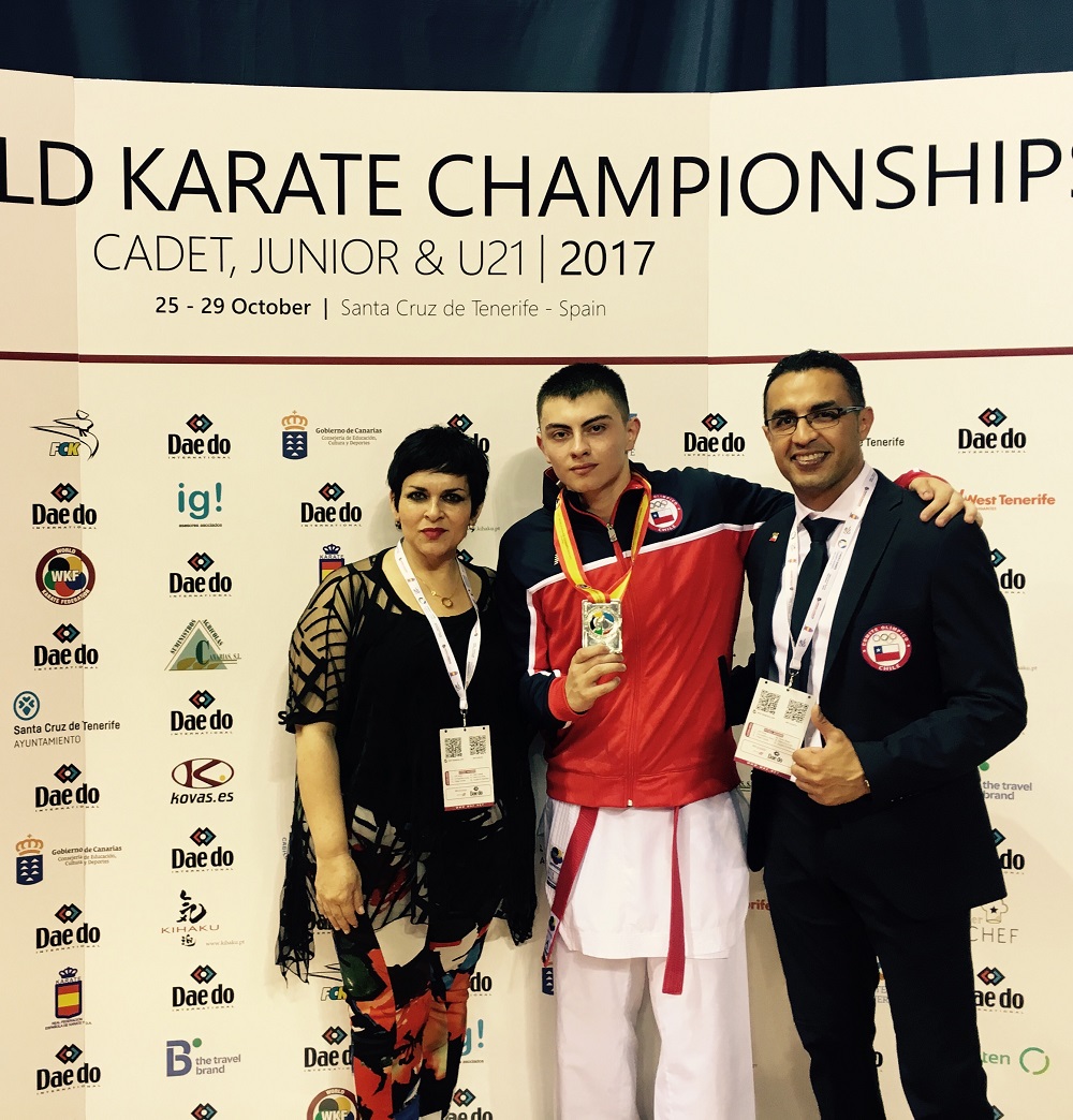Benjamin Nunez, vice-champion du monde Cadets en 2017, est l'un des grands espoirs du Karaté chilien. Il est entouré par la présidente de la Fédération, Maria Angelica Coronil, et Driss El Mannani.
